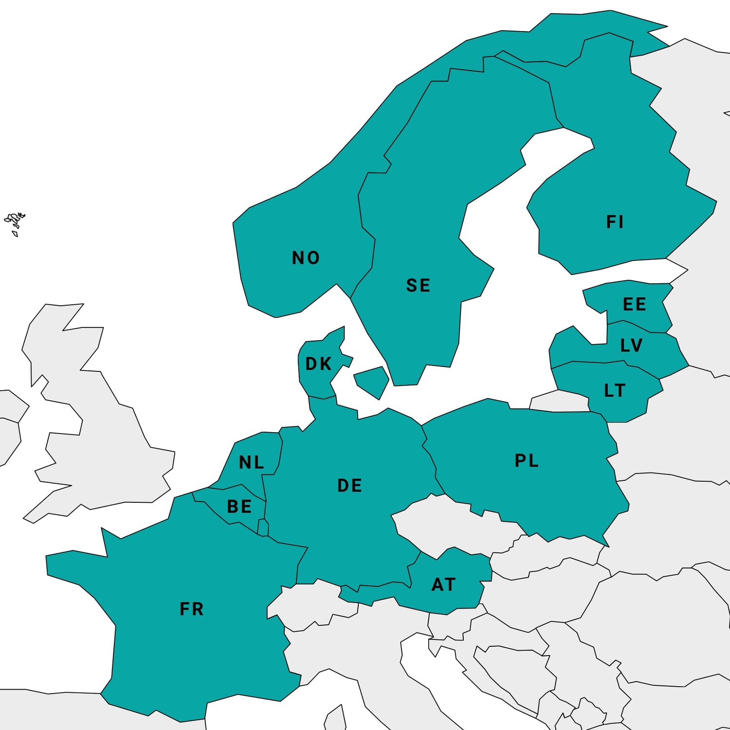 The following countries and their electricity price areas are supported: Austria (AT), Belgium (BE), Germany (DE), Denmark (DK1, DK2), Estonia (EE), Finland (FI), France (FR), Lithuania (LT), Latvia (LV), Netherlands (NL), Norway (NO1, NO2, NO3, NO4, NO5), Poland (PL), Sweden (SE1, SE2, SE3, SE4).